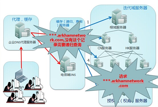 攻击过程如下图是DNS的结构图,这次攻击发起的方式有两种可能:一是攻击者控制了大量被攻击省内的肉鸡;二是利用攻击工具模拟被攻击省份的内网IP。向DNS的递归节点发起随机域名Flood,由于二级域名随机,且在递归服务器的缓存中并不存在,递归服务器需要不断的迭代去查询最终的结果,从而能进一步加剧了递归服务器的负载,造成服务器性能耗尽。